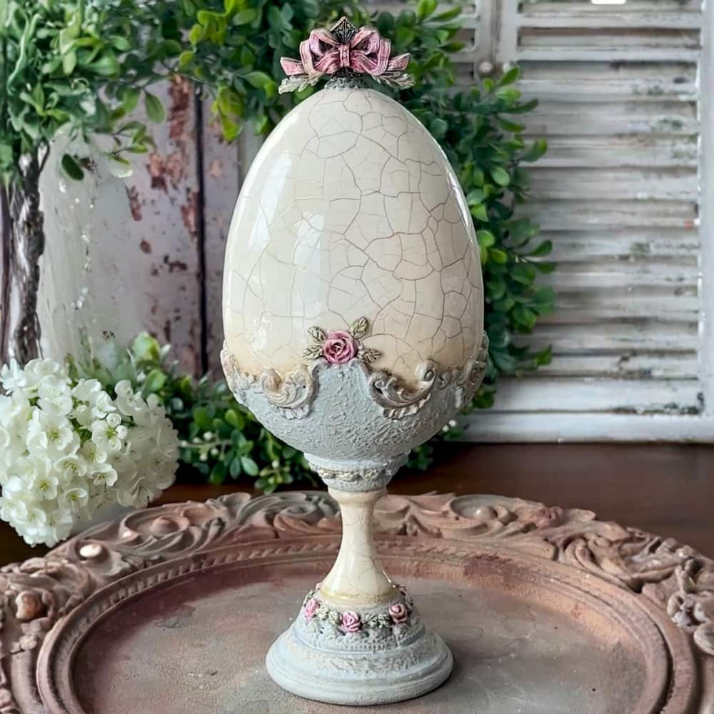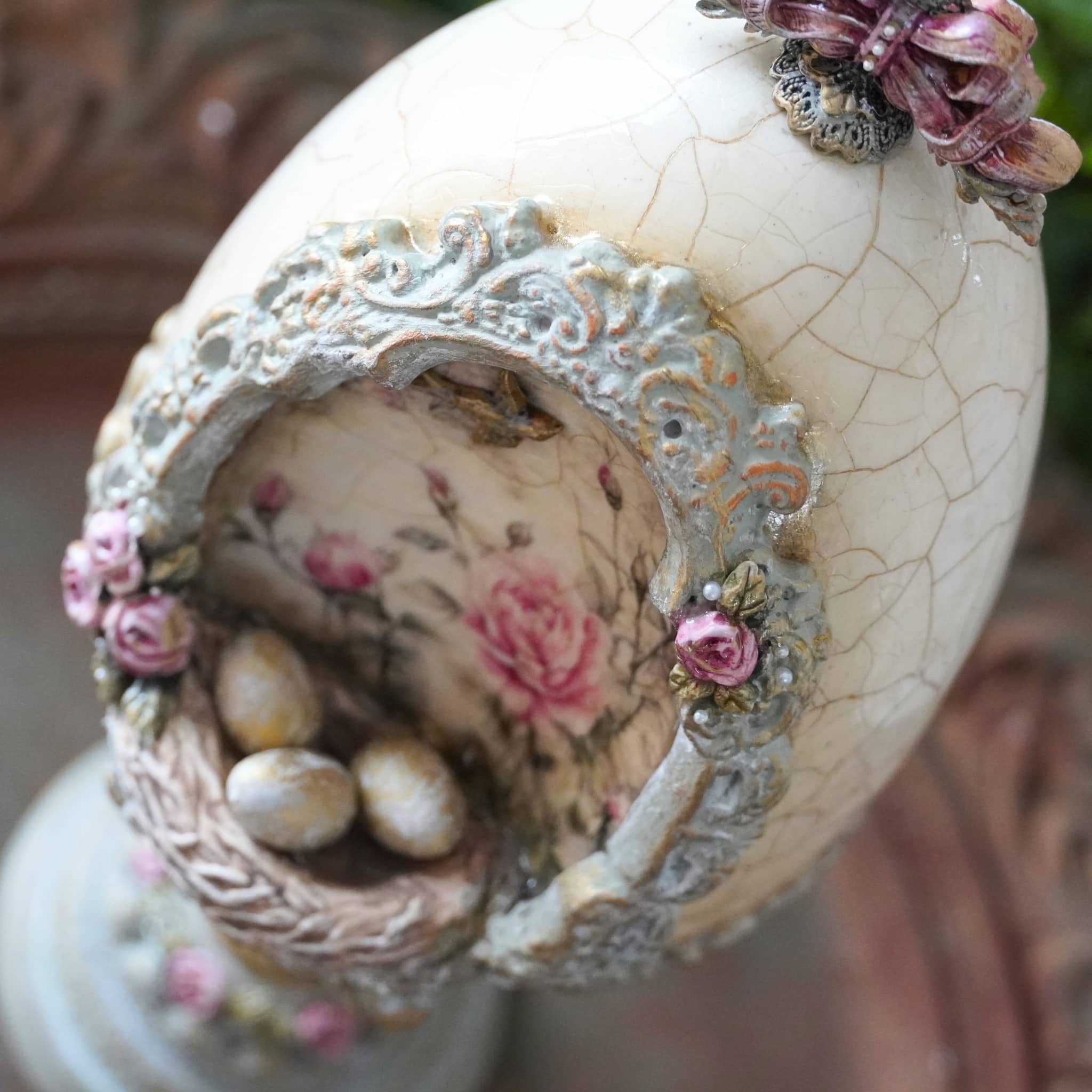 Pisanka osadzona jest na dekoracyjnej podstawce, a cała kompozycja ma około 26 cm wysokości, dzięki czemu staje się wyrazistym elementem aranżacji — nie tylko wielkanocnej, ale również całorocznej, utrzymanej w romantycznym, pałacowym stylu.