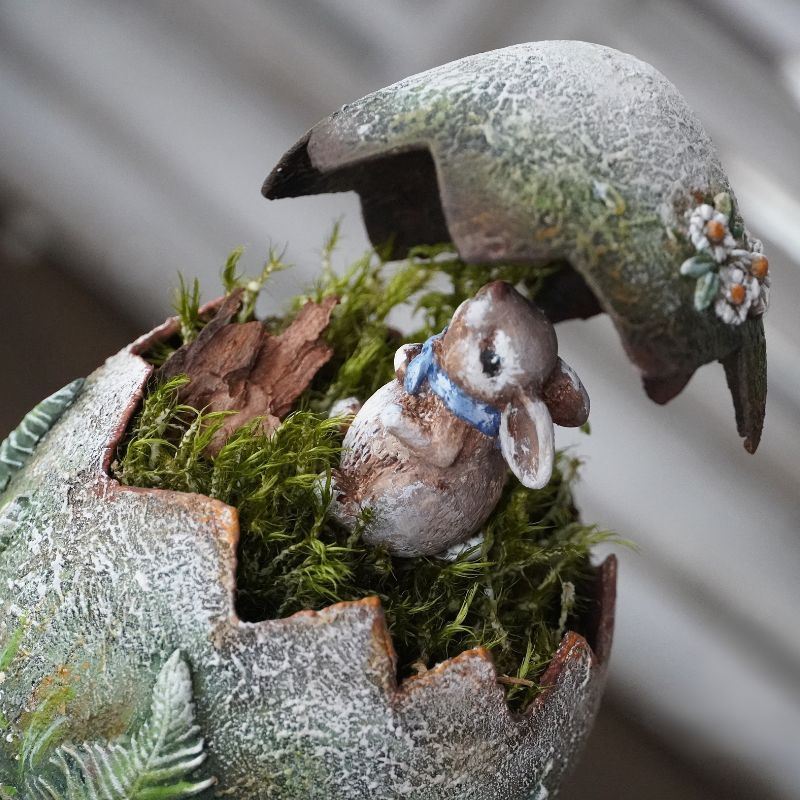 Ten projekt to połączenie malarskiej wyobraźni z techniką decorative painting, która pozwoli Ci stworzyć małe dzieło sztuki o wdzięku i charakterze. Bazą pracy jest pisanka plastikowa o wysokości 12 cm, umieszczona na stabilnej drewnianej podstawie o wysokości 8 cm. Całość tworzy bajkową scenkę – wśród paproci i kwiatów wyłania się uroczy zajączek, który wygląda jak wyjęty z ilustracji do dziecięcej książki.