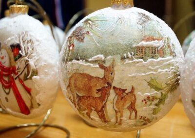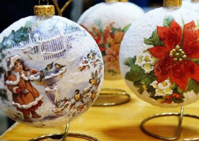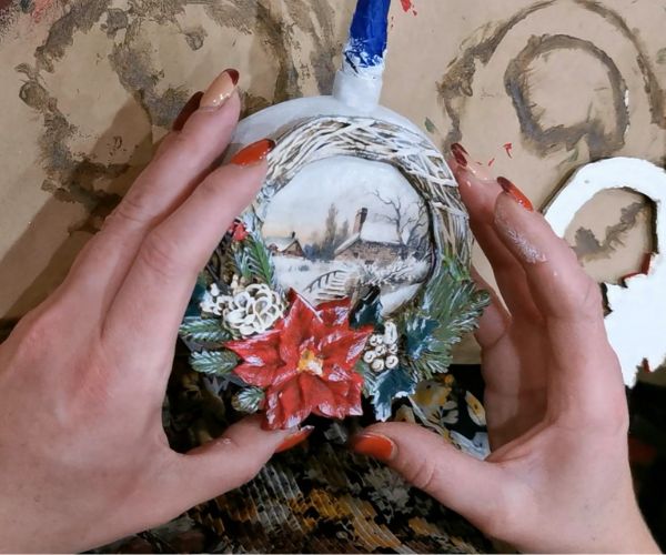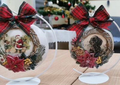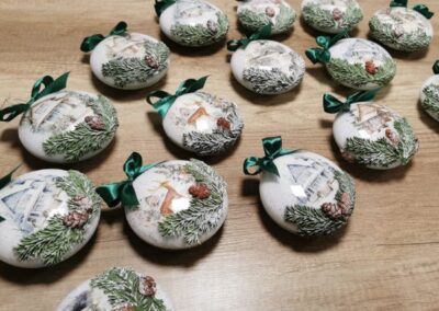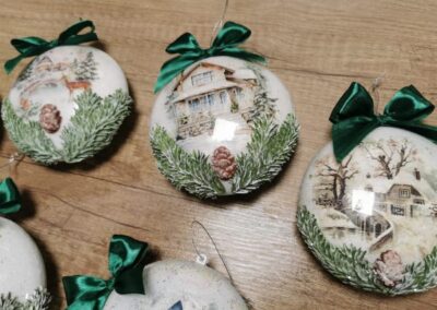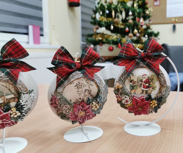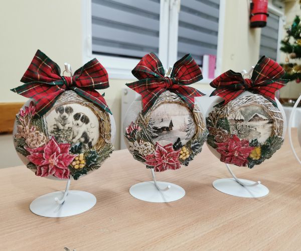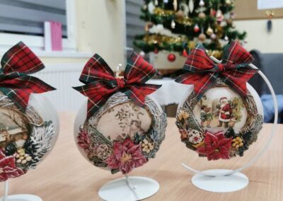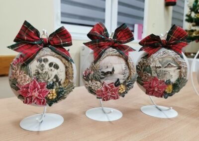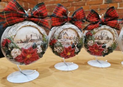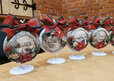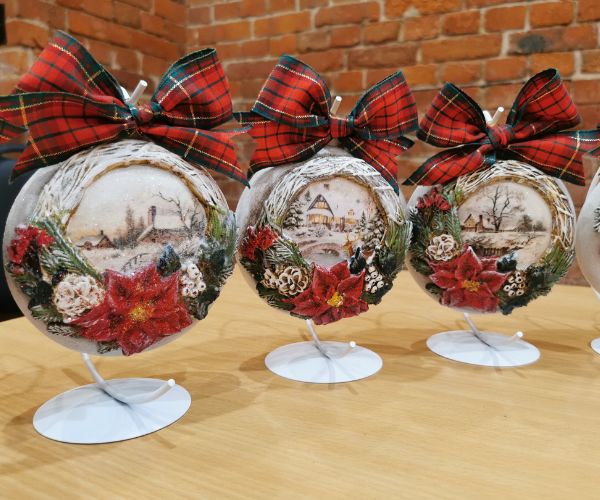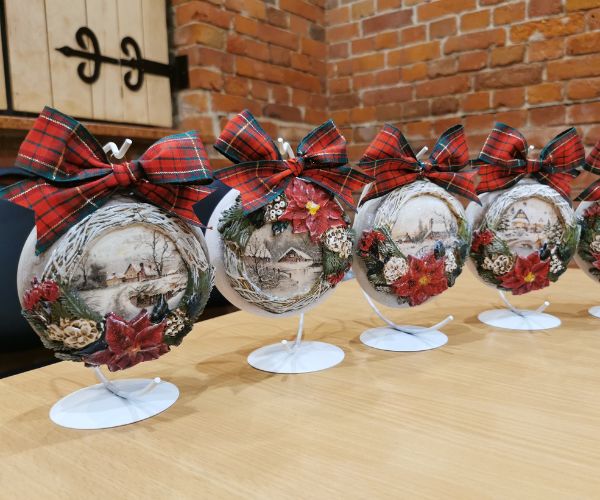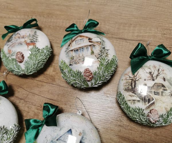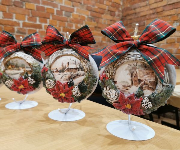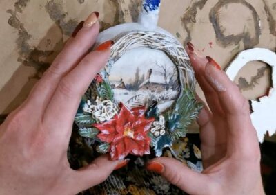 Podczas warsztatów wykonamy urokliwe medaliony choinkowe o średnicy 11 cm, zdobione techniką decoupage od środka oraz wzbogacone o elementy 3D. Wewnątrz każdej bombki zamkniemy klimatyczne zimowe scenki z domkami, które zachwycą swoim bajkowym charakterem.