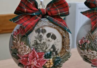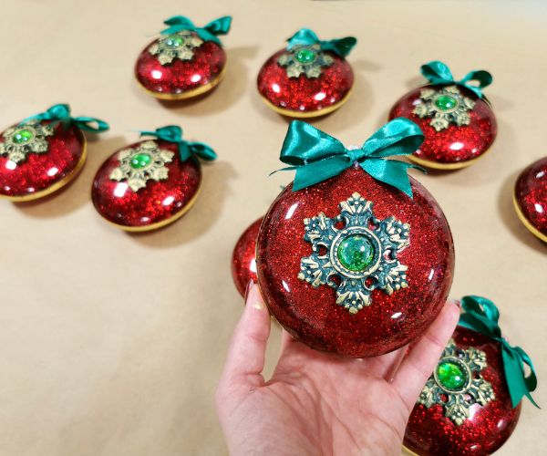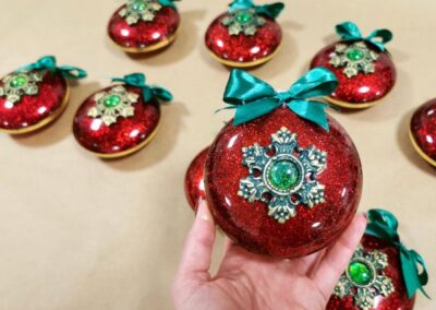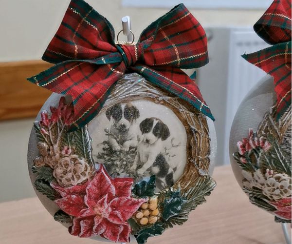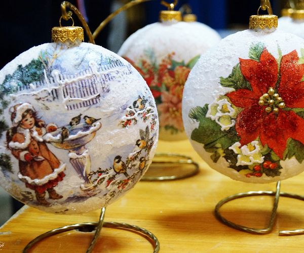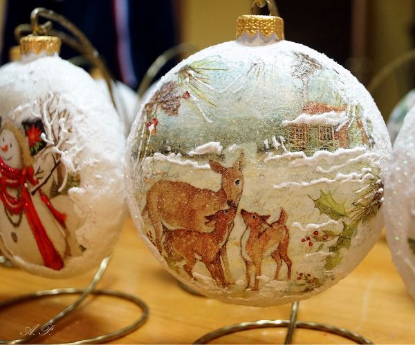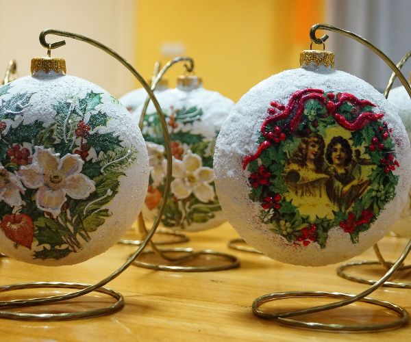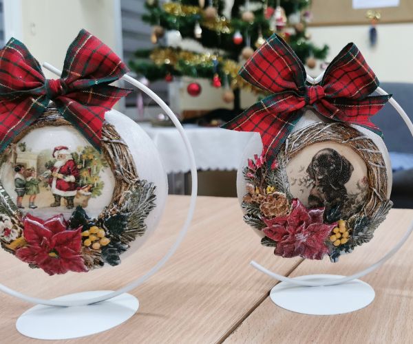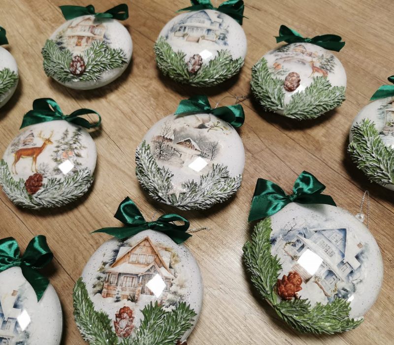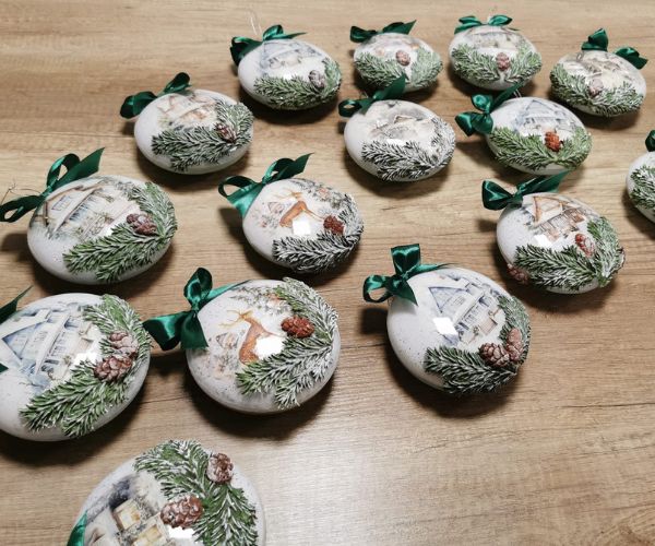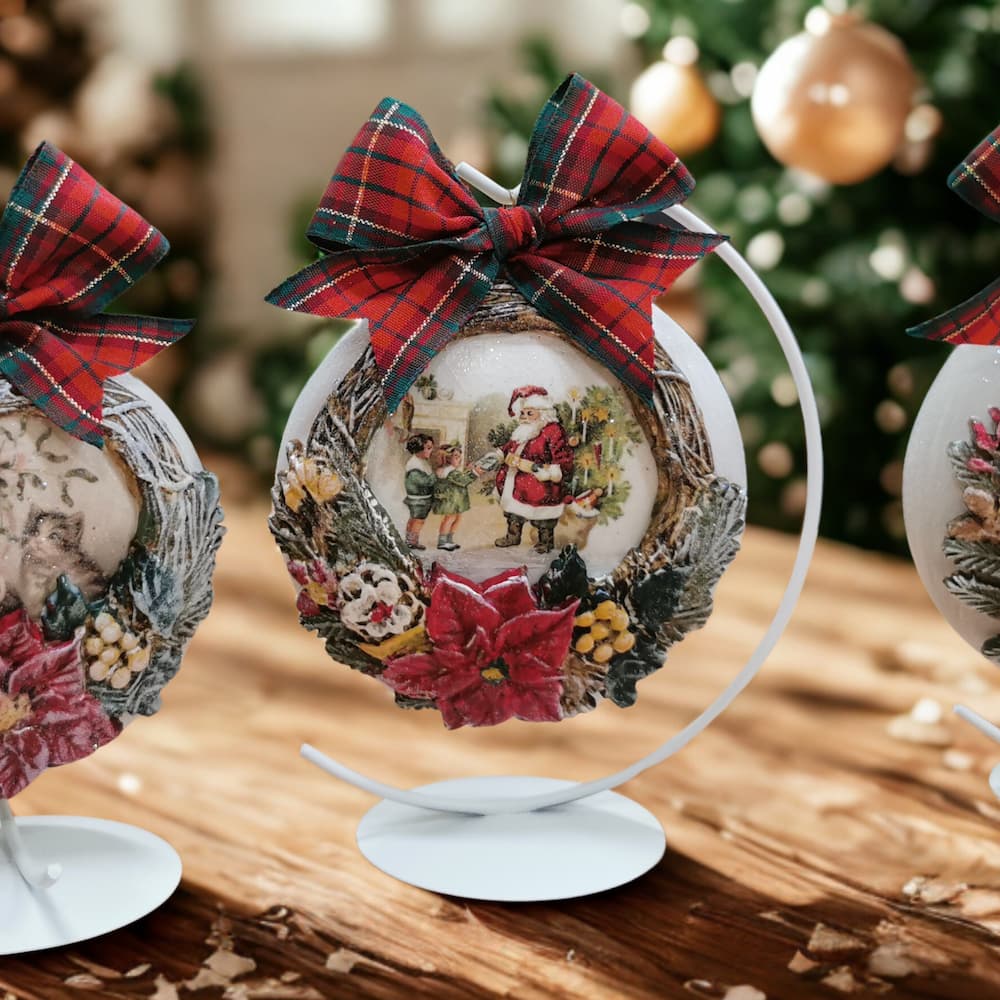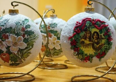 Na tych świątecznych warsztatach stworzymy eleganckie medaliony choinkowe o średnicy 12 cm, ozdobione techniką decoupage z elementami 3D. Każda bombka zostanie zawieszona na stylowym metalowym wieszaczku i będzie przedstawiać kompozycję z dekoracyjnym świątecznym wiankiem.