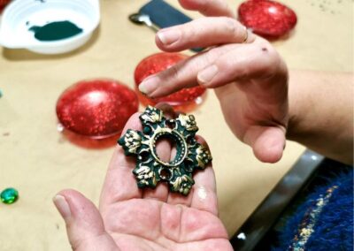 Podczas tych wyjątkowych warsztatów uczestnicy stworzą ozdobny medalion choinkowy o średnicy 11 cm, zdobiony techniką mixed media z efektem rubinu i szmaragdu, uzupełnionym złoceniami. To projekt dla tych, którzy cenią wyraziste barwy, elegancję i biżuteryjny styl świątecznych dekoracji.