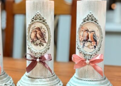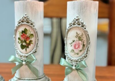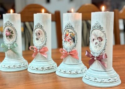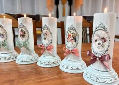 Propozycja warsztatowa obejmuje wykonanie niezwykłych dekoracyjnych świec, które… nigdy się nie wypalą! Uczestnicy stworzą imitacje świec na drewnianych bazach i ceramicznych podstawach, dekorując je techniką decoupage z elementami 3D w postaci eleganckich ornamentów i dodatków pasmanteryjnych.