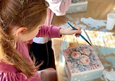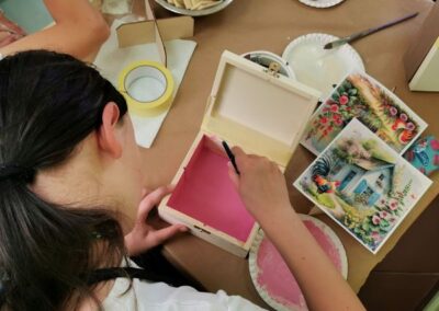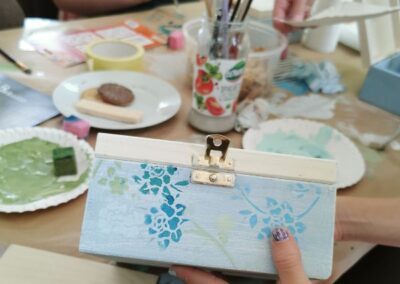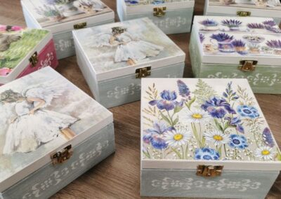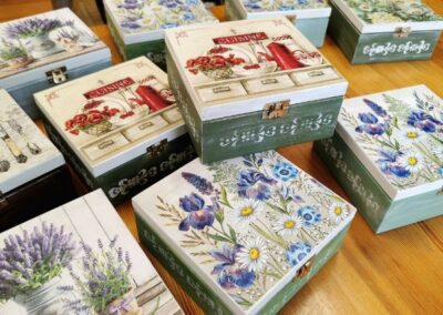 Propozycja warsztatowa obejmuje wykonanie eleganckich drewnianych herbaciarek z czterema przegródkami, które z powodzeniem mogą pełnić również funkcję uroczych szkatułek na drobiazgi. Projekty będą zdobione techniką decoupage, malowane w pastelowych kolorach, z użyciem szablonów malarskich oraz uzupełnione o dodatki pasmanteryjne – koronki, tasiemki i inne dekoracyjne detale.