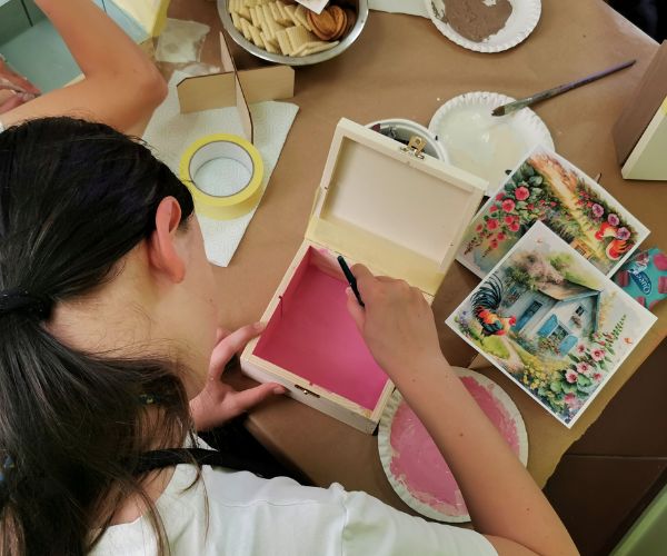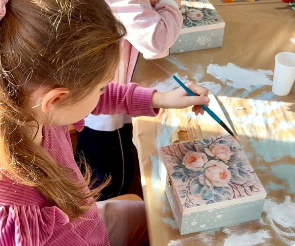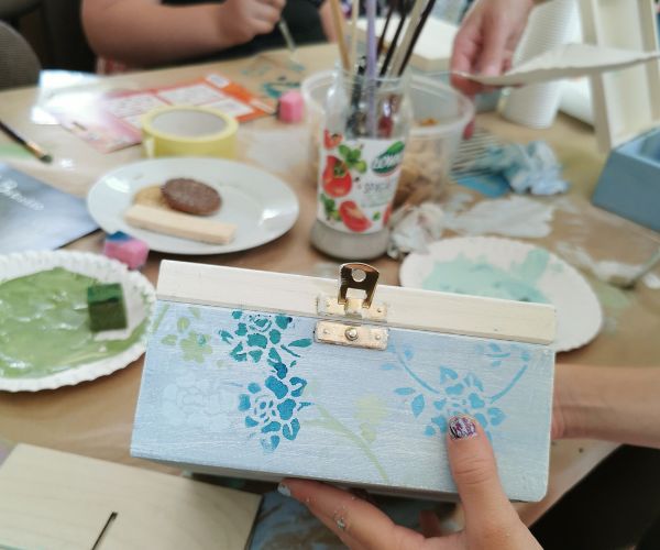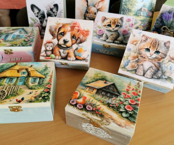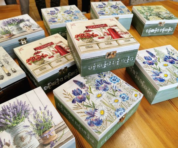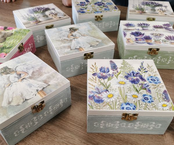 Propozycja warsztatowa obejmuje wykonanie eleganckich drewnianych herbaciarek z czterema przegródkami, które z powodzeniem mogą pełnić również funkcję uroczych szkatułek na drobiazgi. Projekty będą zdobione techniką decoupage, malowane w pastelowych kolorach, z użyciem szablonów malarskich oraz uzupełnione o dodatki pasmanteryjne – koronki, tasiemki i inne dekoracyjne detale.