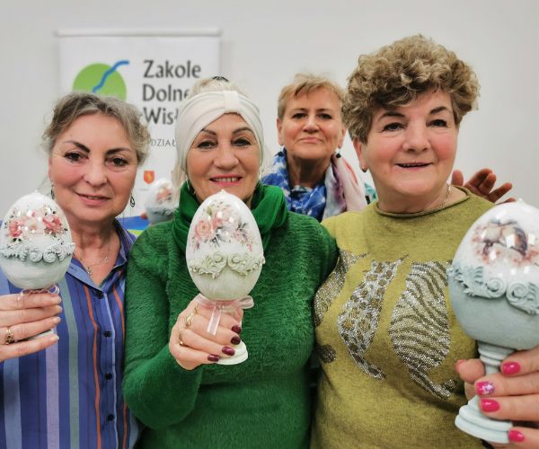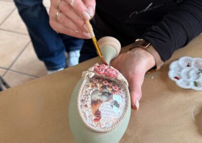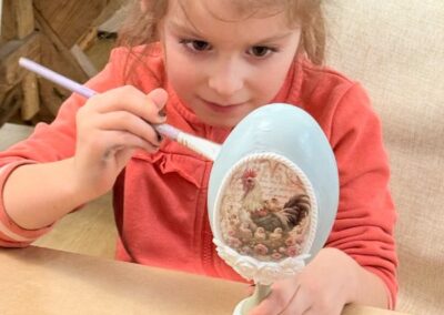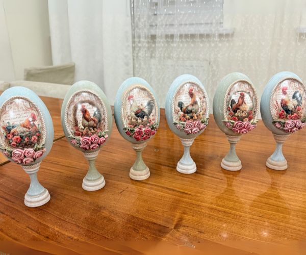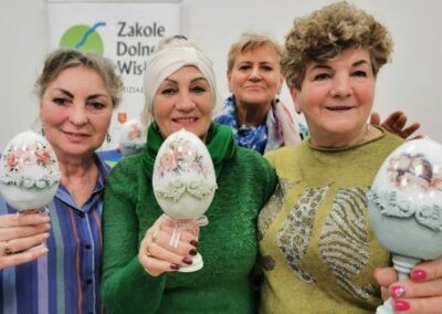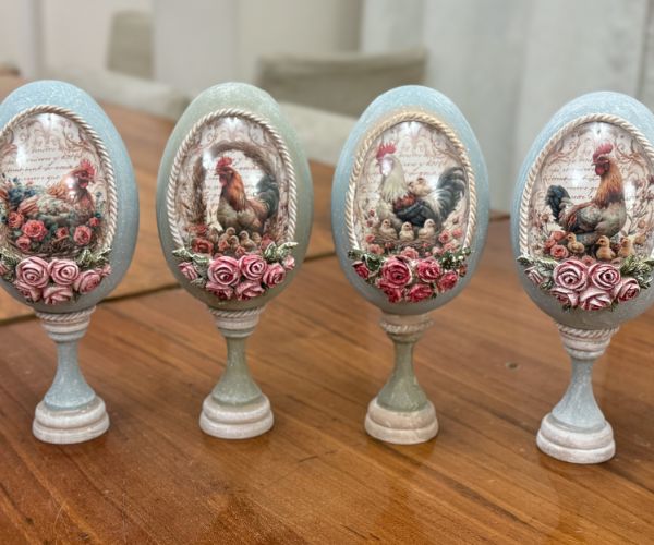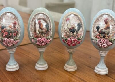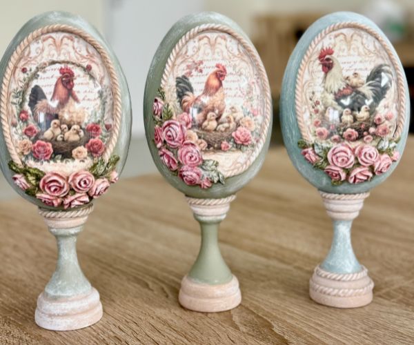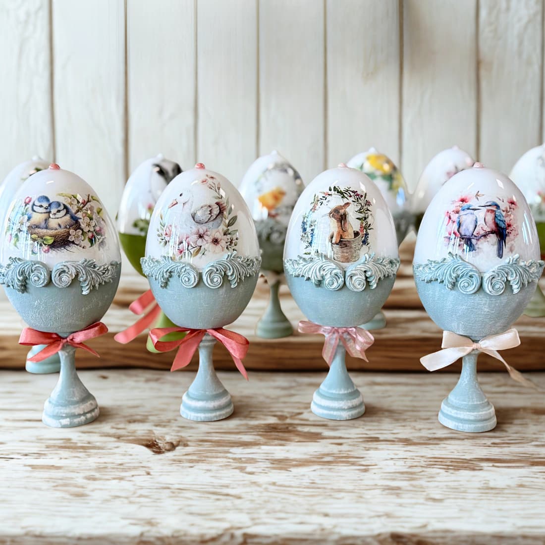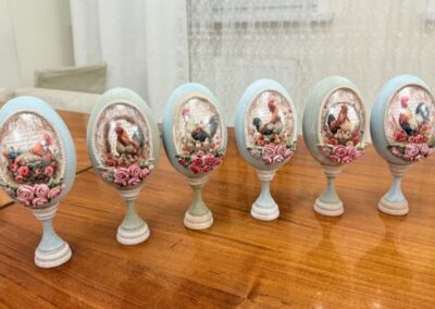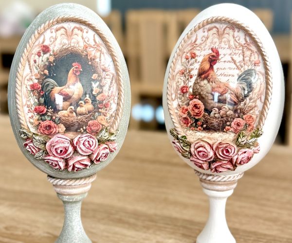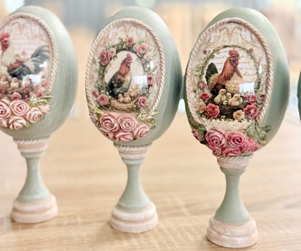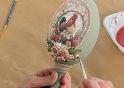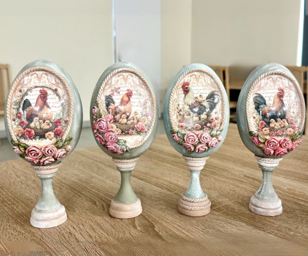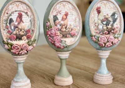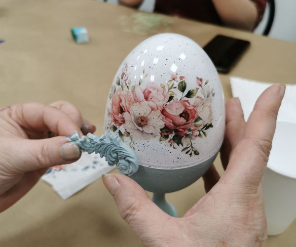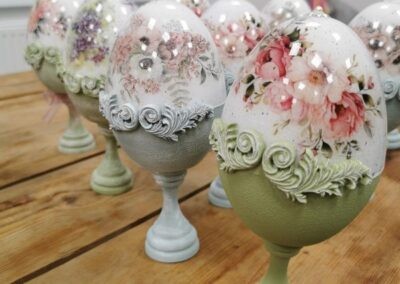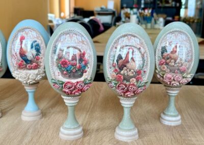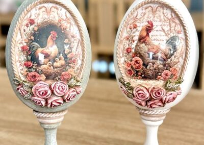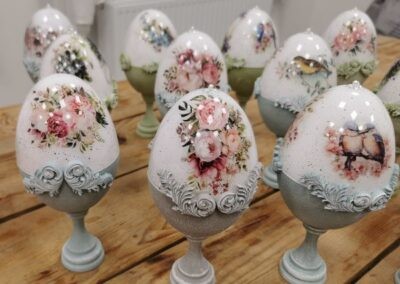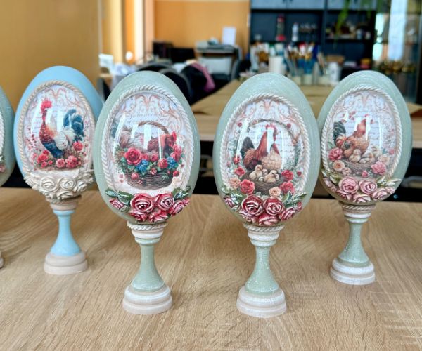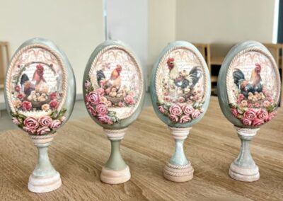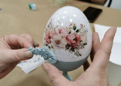 Propozycja warsztatowa obejmuje wykonanie eleganckich pisanek akrylowych o wysokości 12 cm, umieszczonych na drewnianej podstawce i zdobionych techniką decoupage oraz ornamentami 3D w pastelowej kolorystyce.