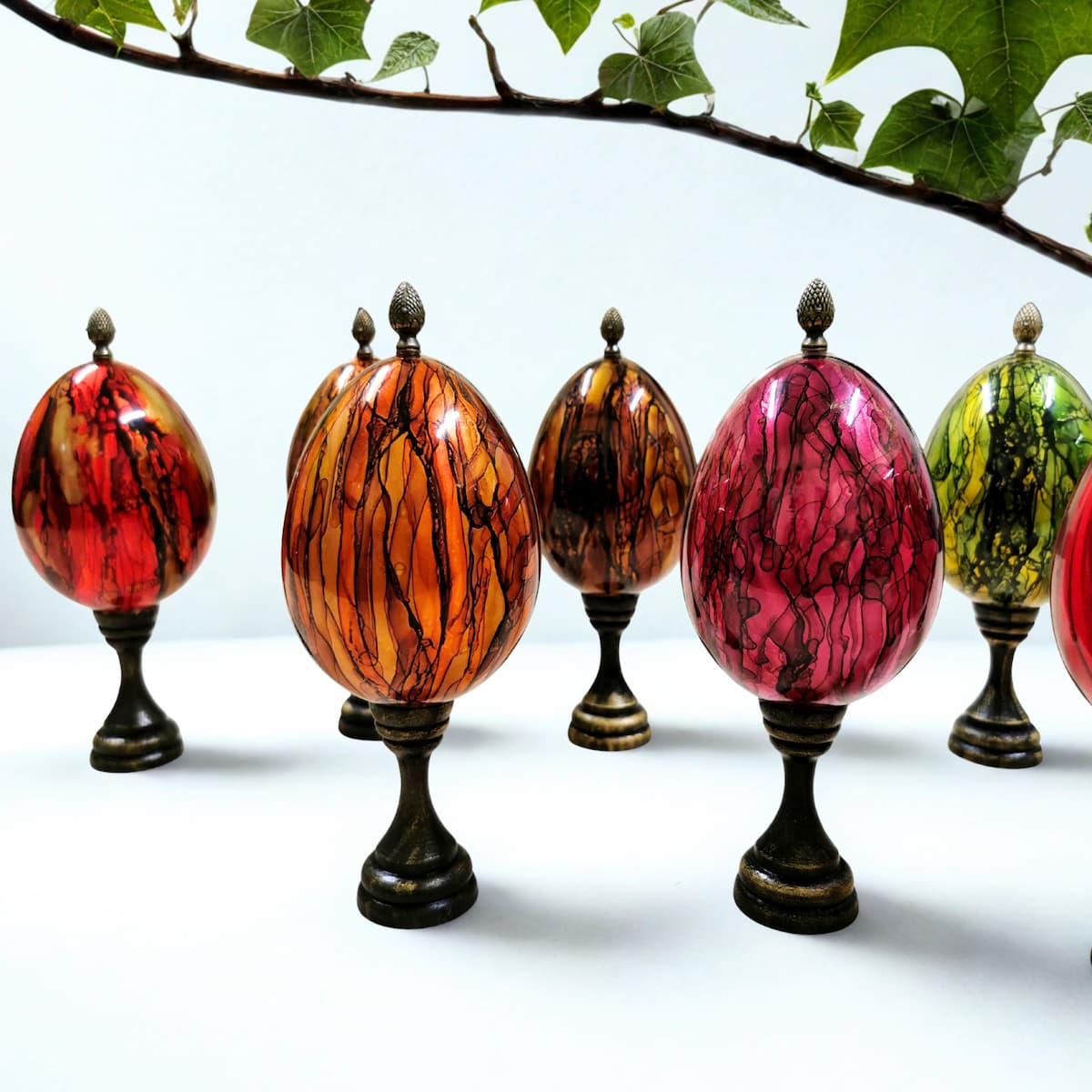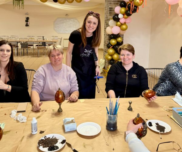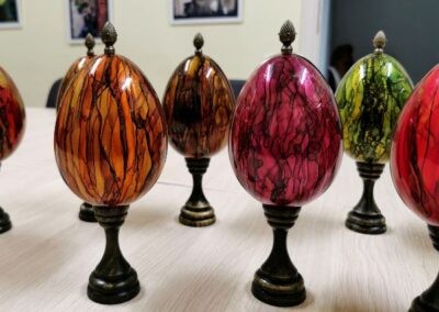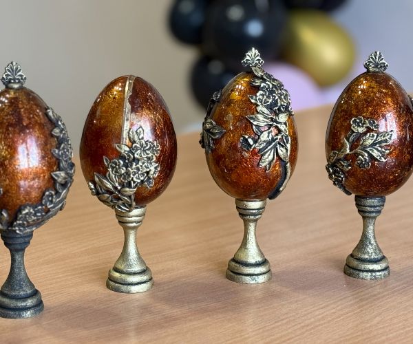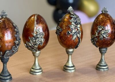 Projekt warsztatowy obejmuje wykonanie pisanek akrylowych o wysokości 12 cm, umieszczonych na drewnianej podstawce i zdobionych w technice mixed media z efektem a’la politura. To połączenie klasycznej formy z nowoczesnym wykończeniem, które nadaje dekoracjom szlachetnego charakteru.