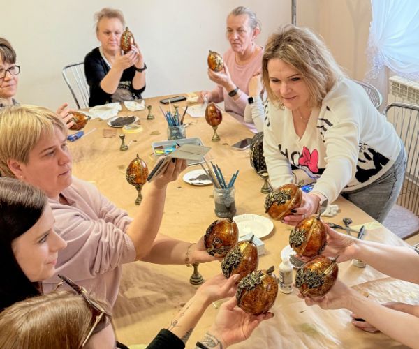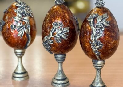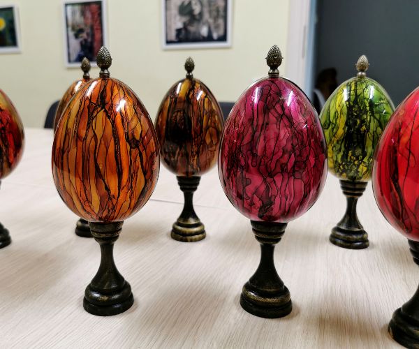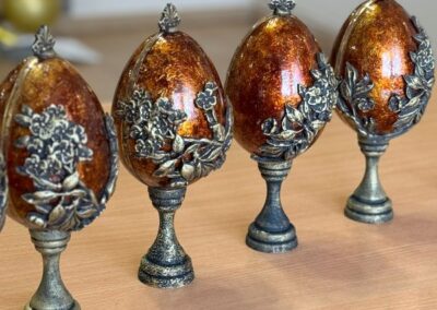 Projekt warsztatowy obejmuje wykonanie pisanek akrylowych o wysokości 12 cm, umieszczonych na drewnianej podstawce i zdobionych techniką mixed media z efektem bursztynu oraz postarzanego srebra lub złota.