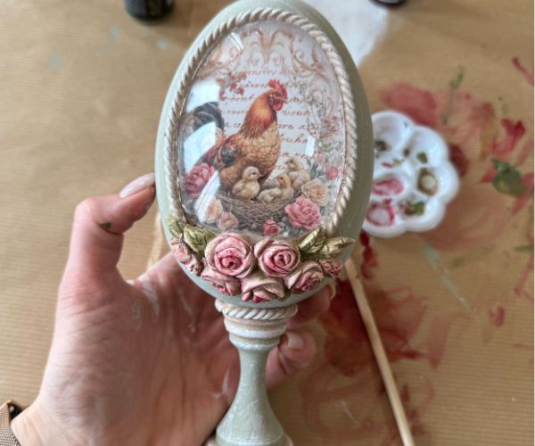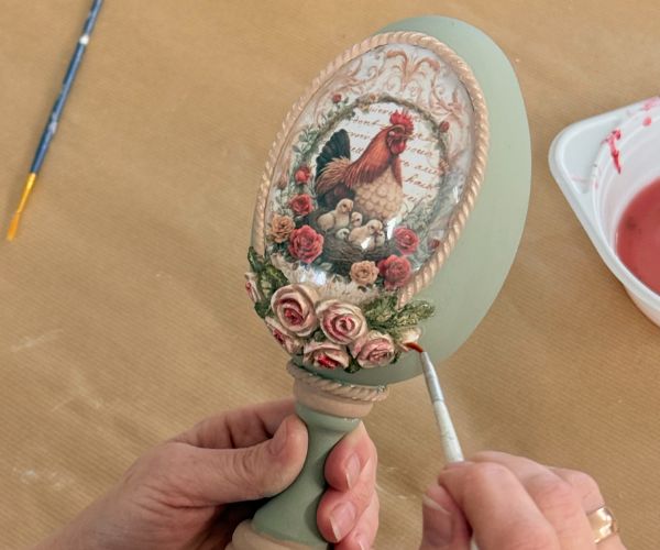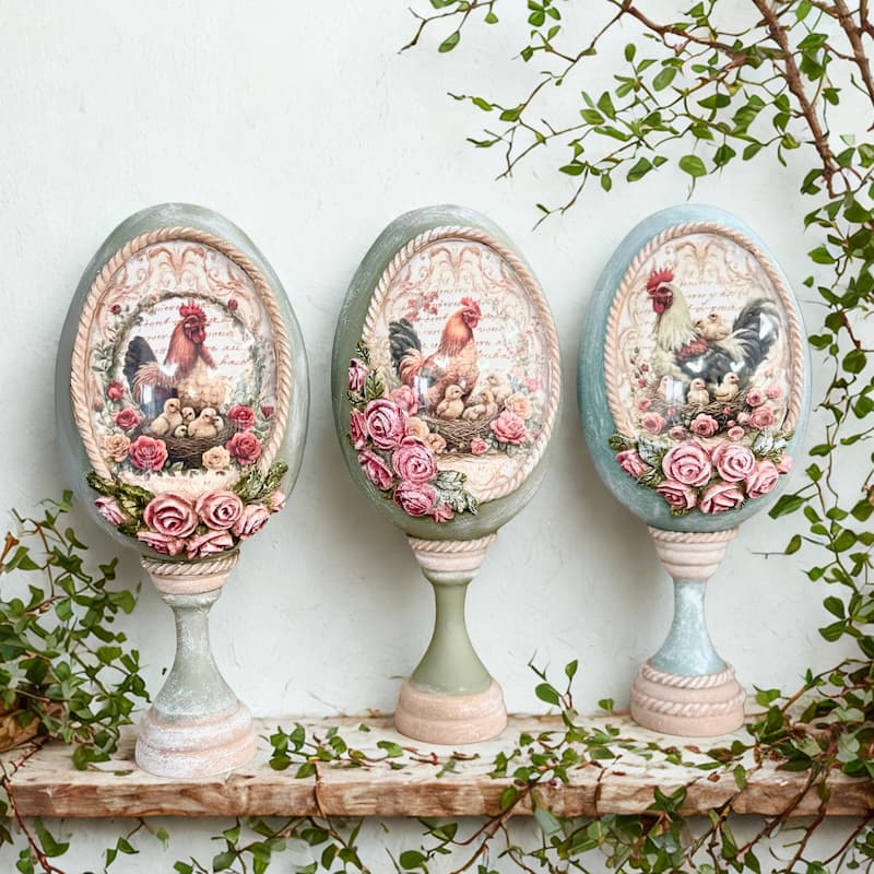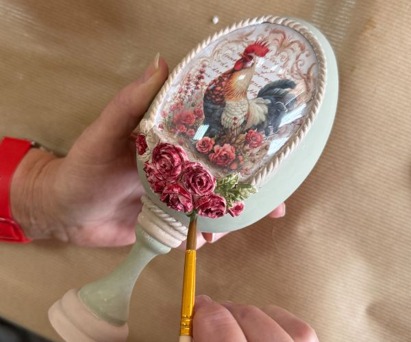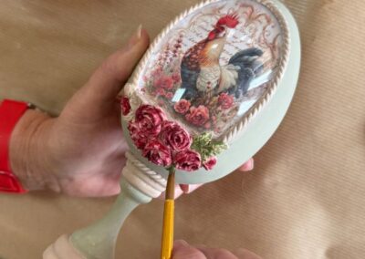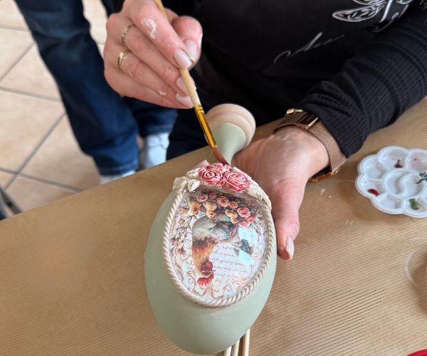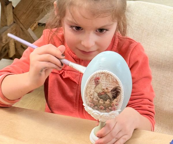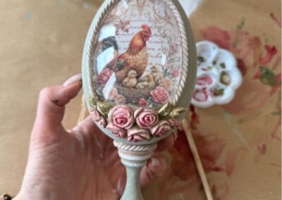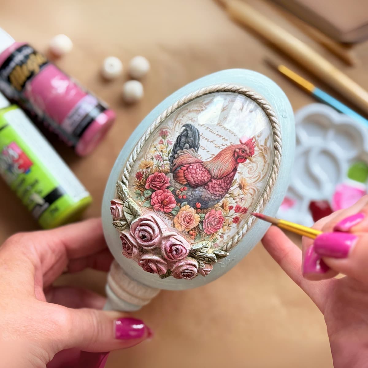 Propozycja warsztatowa obejmuje wykonanie wyjątkowej pisanki akrylowej o wysokości 12 cm, umieszczonej na drewnianej podstawce, zdobionej zarówno od środka, jak i na zewnątrz. Wnętrze pisanki wypełni uroczy, sielski obrazek z kurkami i kogutami, a całość dopełni przestrzenne różane gniazdko wykonane z elementów 3D.